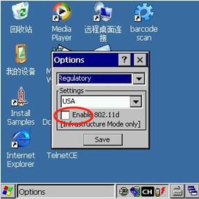 2、點(diǎn)擊上圖彈出菜單中的“Options”,在彈出的窗口中上部下拉框中選擇“Regulatory”,然后將下面“Settings”中“Enable 802.11d”前面的勾去掉,注意,這個(gè)選項(xiàng)經(jīng)我試驗(yàn)必須將勾去掉,因?yàn)閲?guó)內(nèi)的無(wú)線網(wǎng)一般是802.11g,按理說這個(gè)802.11d選中應(yīng)該沒事的,但選中它時(shí),無(wú)線網(wǎng)就連不上!設(shè)置后應(yīng)該是下圖的樣子: