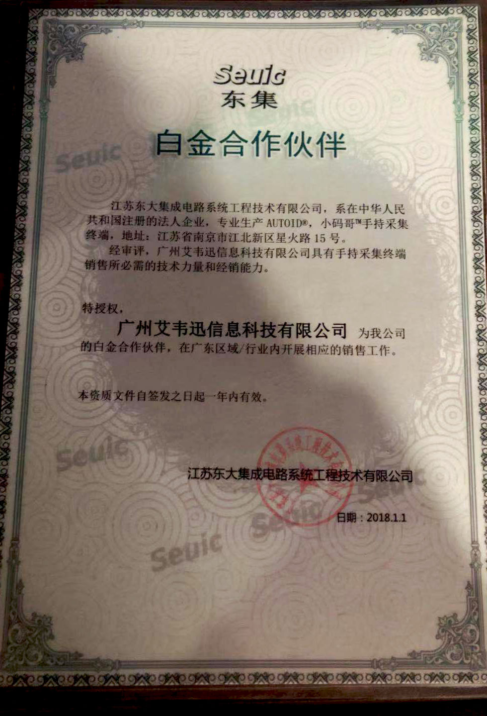 廣州艾韋迅信息科技有限公司于20181月接到江蘇東大集成電路系統工程技術有限公司通知,授予公司2018年度白金業務合作伙伴證書。