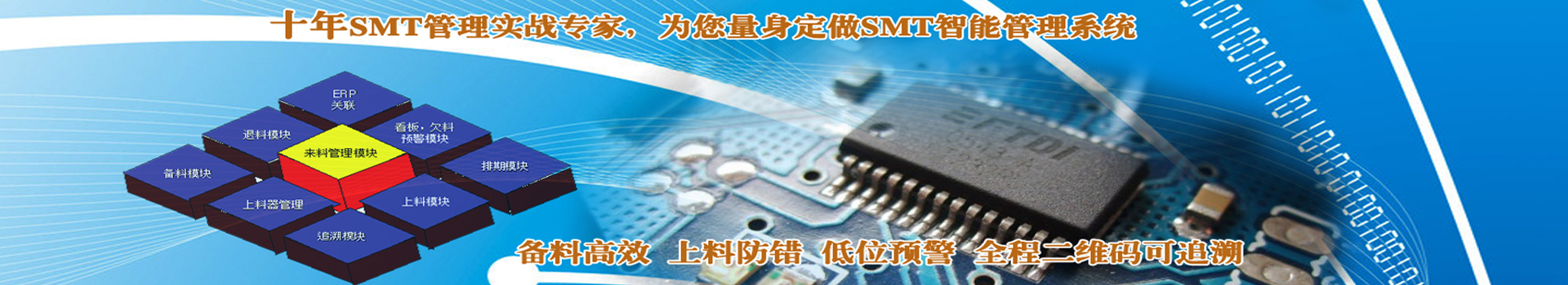 生產追溯系統|SMT質量追溯系統:利用條碼或RFID技術對人機料法環的全程僅有碼追溯。全程追溯:原材料|生產過程|產品售后追溯;電子化生產管理:生產防錯、生產管理功能強大;質量管控:IQC、IPQC、OQC、SPC 全面管控